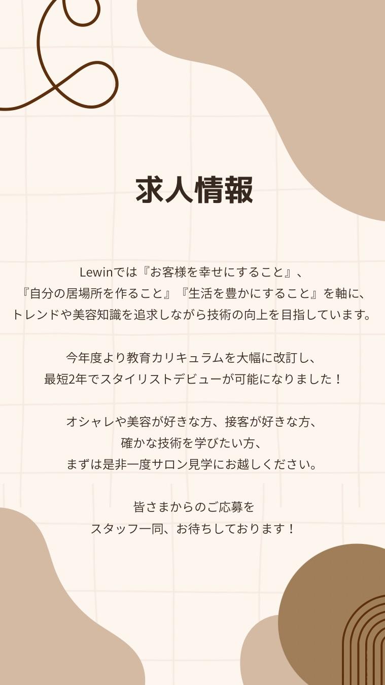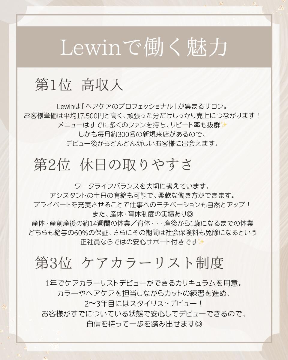 Lewin(レウィン)とは結びつけるという意味が込められています。求める理想に近付けられるよう髪質、⾻格に対しての似合わせ、ライフスタイルまでを⾒越しお客様と⻑くお付き合いしていけるようなスタイルを提案します。